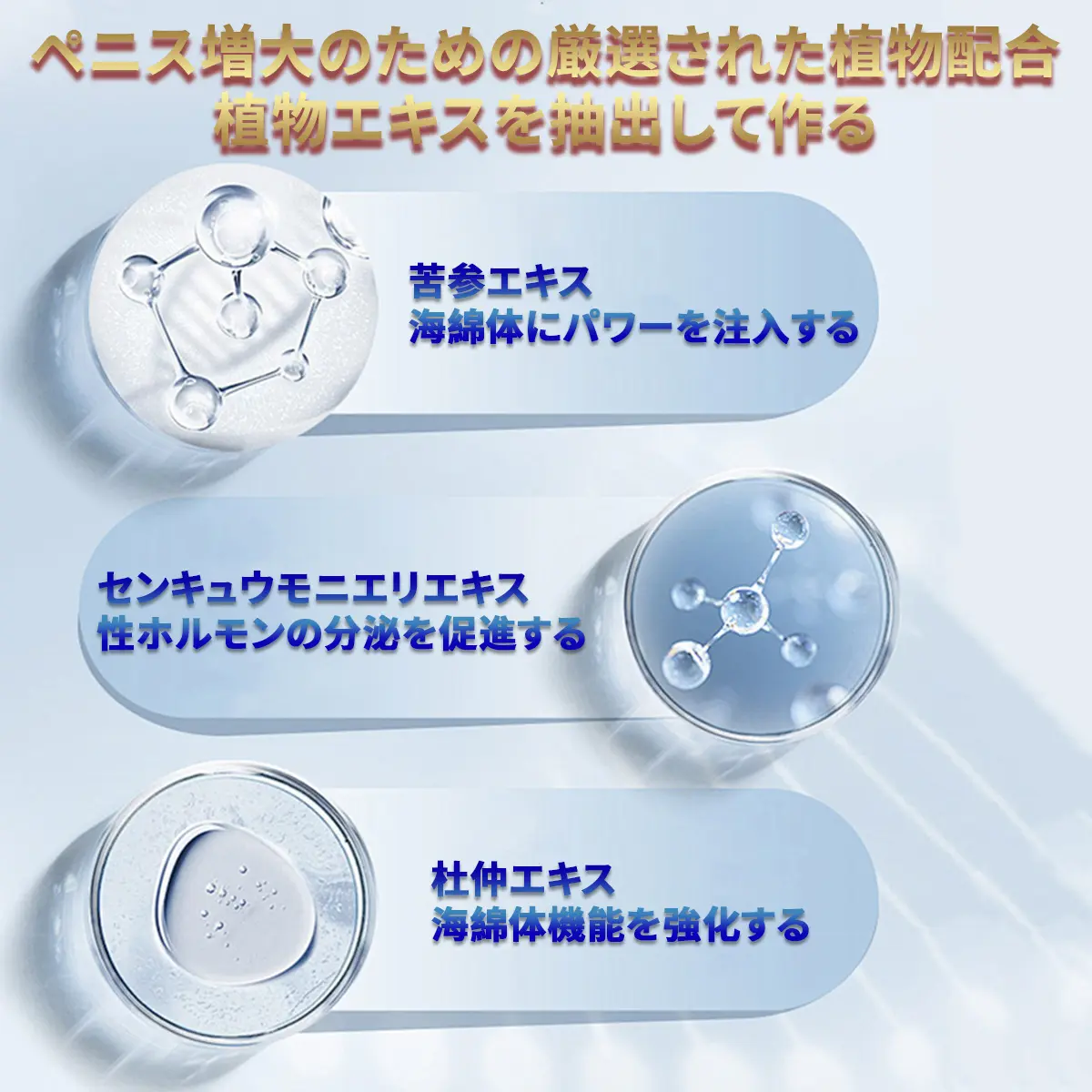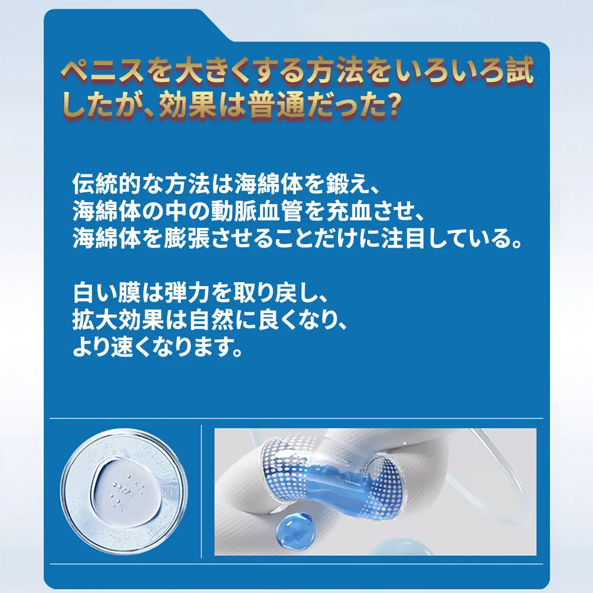 当社の增大クリームはペニスをマッサージする際に外用のクリームです。貴重な植物エキスを配合しているので、塗布・マッサージ後のペニスの海綿体の血行を促進しながら、海綿体を満たす血液量を増やす、海綿体への栄養補給や修復の役割を果たして、陰茎に増大する栄養成分を補充します。効果が出るまで、2~4週間の連続使用が必要です。手術による増大やホルモン剤の使用ほど顕著な効果は得られませんが、安全性は確保されています。