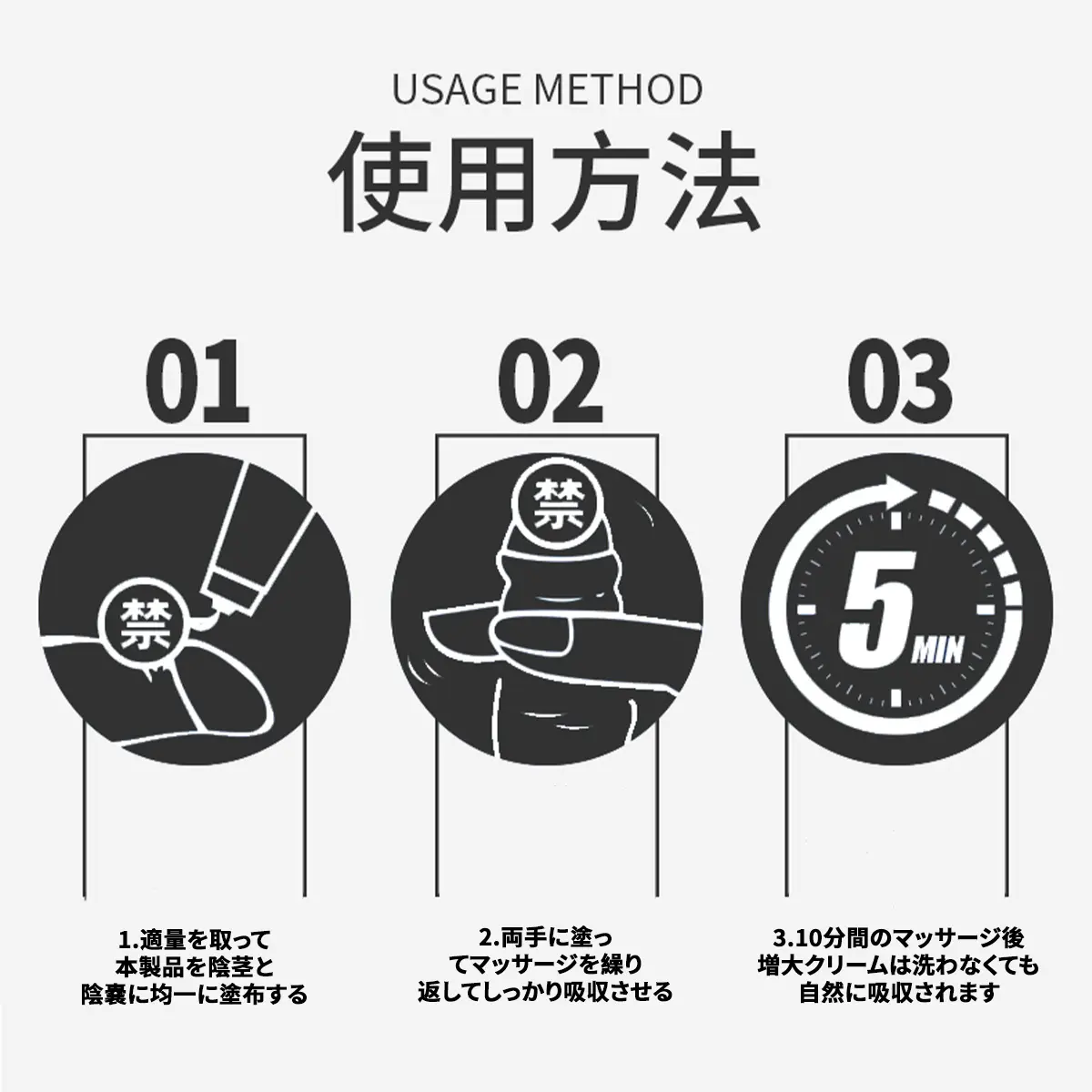 マッサージの前に温かいタオルで陰茎を温めてからのご使用がお勧めします。温もりは陰茎に流れる血液を増やす、皮膚の弾力を高め、次にペニス増大クリームをペニスと睾丸に塗りながら吸収されるまで手でマッサージするとより良い結果が得られます。